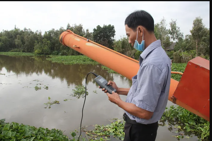 Cán bộ nông nghiệp tỉnh Hậu Giang đo độ mặn trên các tuyến sông