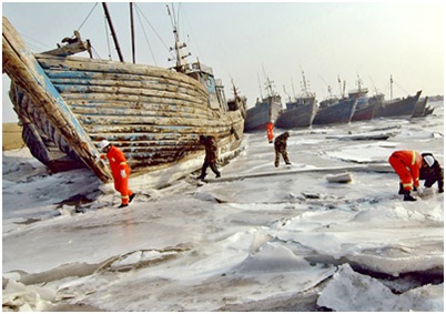Thuyền bè bị mắc kẹt do nước biển đóng băng tại Trung Quốc. |