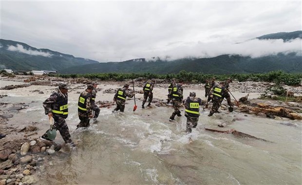 Nhân viên cứu hộ làm nhiệm vụ tại huyện Miện Ninh, tỉnh Tứ Xuyên, Trung Quốc, ngày 28/6/2020. (Ảnh: THX/TTXVN)