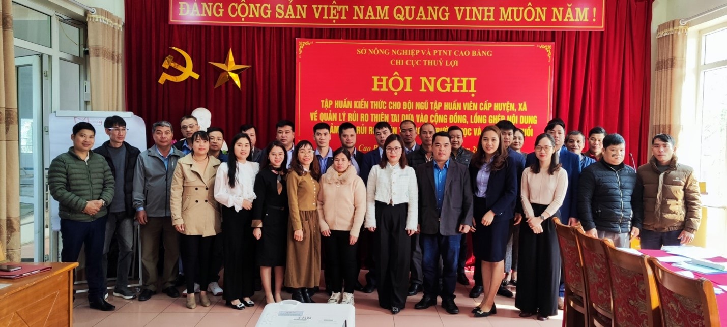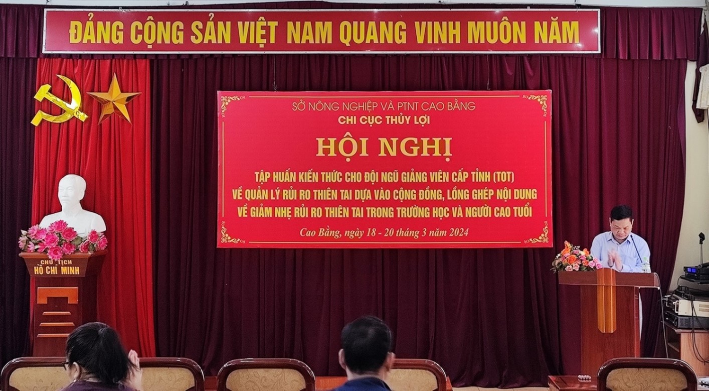 Hai lớp tập huấn bồi dưỡng kiến thức cho đội ngũ cán bộ tập huấn viên cấp huyện, xã về quản lý RRTT DVCĐ lồng ghép nội dung về giảm nhẹ rủi ro thiên tai (GNRRTT) trong trường học và người cao tuổi tại Nhà khách UBND tỉnh. Tổng số học viên gồm 64 người là cán bộ, công chức, viên chức các phòng, ban, đơn vị cấp huyện, cấp xã. Các học viên được giới thiệu các chuyên đề: cập nhật những tài liệu văn bản, danh mục các văn bản quy phạm pháp luật (QPPL) mới/sửa đổi, bổ sung có liên quan đến công tác phòng, chống thiên tai; bồi dưỡng về kiến thức, tăng cường năng lực về quản lý RRTT DVCĐ, lồng ghép nội dung về GNRRTT trong trường học và người cao tuổi; trang bị một số kỹ năng tập huấn để lập kế hoạch, tổ chức và thực hiện tập huấn thực hiện đề án nâng cao nhận thức cộng đồng và quản lý RRTT DVCĐ tại địa phương mình (Lớp 1 từ ngày 20/3/2024 đến ngày 21/3/2024, với 31 học viên các huyện: Bảo Lâm, Nguyên Bình, Thạch An, Hà Quảng, thành phố Cao Bằng; Lớp 2 từ ngày 21/3/2024 đến 22/3/2024, với 33 học viên các huyện: Bảo Lạc, Hạ Lang, Hòa An, Trùng Khánh, Quảng Hòa).