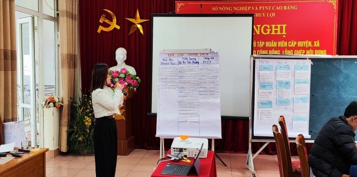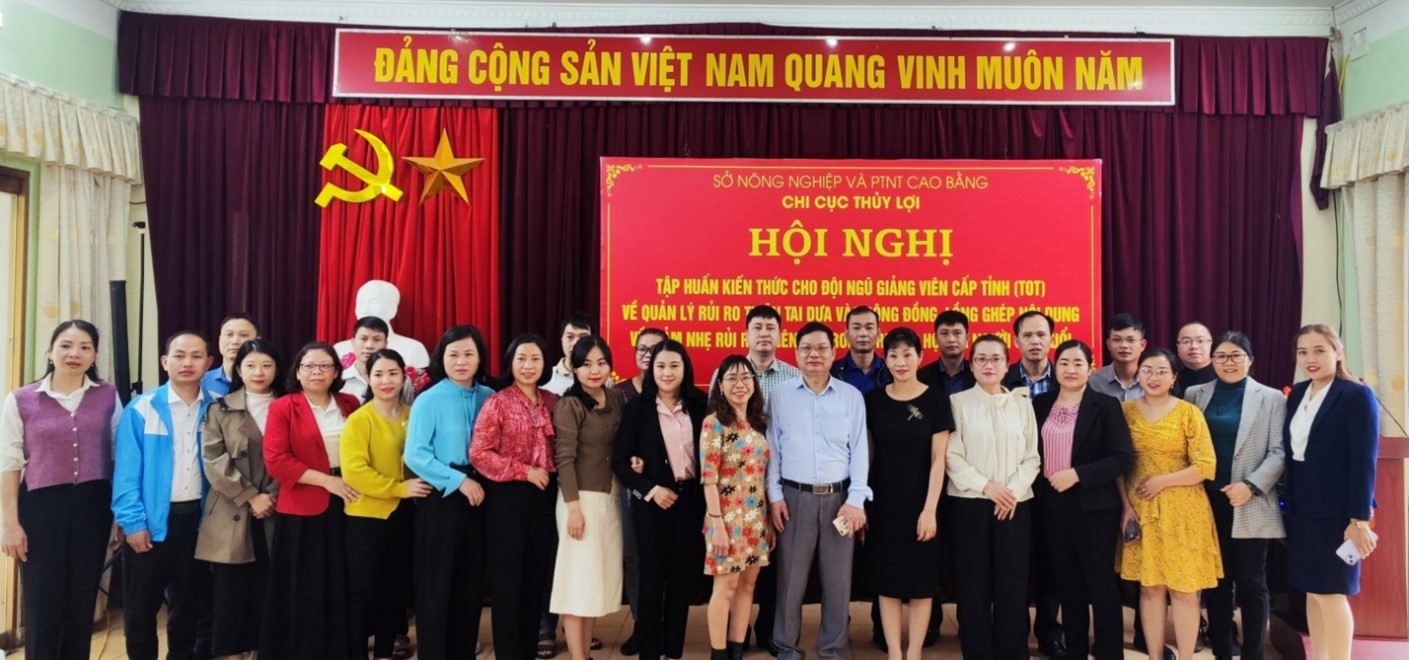 -Một lớp tập huấn kiến thức cho đội ngũ giảng viên cấp tỉnh (TOT) bắt đầu từ ngày 18/3/2024 đến ngày 20/3/2024 tại Khách sạn Bằng Giang về Quản lý RRTT DVCĐ, lồng ghép nội dung về giảm nhẹ rủi ro thiên tai trong trường học và người cao tuổi, gồm 27 học viên là cán bộ, CCVC thuộc các sở, ngành, cơ quan đơn vị cấp tỉnh: Sở Nông nghiệp và Phát triển nông thôn, Sở Tài nguyên và Môi trường, Sở Giáo dục và Đào tạo, Hội Liên hiệp Phụ nữ Việt Nam tỉnh, Hội Chữ thập đỏ tỉnh, Ủy ban Mặt trận Tổ quốc Việt Nam tỉnh, Đoàn Thanh niên CS Hồ Chí Minh tỉnh Cao Bằng, Hội Người cao tuổi tỉnh. Các học viên tham gia lớp tập huấn được bồi dưỡng các nội dung kiến thức về phòng, chống thiên tai, quản lý rủi ro thiên tai, kỹ năng thiết kế và trình bày bài giảng; một số phương pháp tập huấn dành cho người lớn; tập huấn về các hoạt động thực hiện đề án nâng cao nhận thức cộng đồng và quản lý RRTT DVCĐ. Quá trình tập huấn, các học viên thành lập các nhóm thảo luận, thực hành và thực hiện thi giảng (trình bày) tại lớp tập huấn.