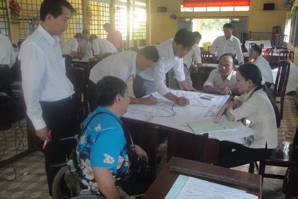 10:58:0, 11/10/2014 Even though it was long and hard, our trip was very interesting and useful and we gathered many new experiences and knowledge. We, members of the Disabled People’s Organizations (DPOs) of Hanoi and Quang Nam, spent ten days in Vinh Thuan Dong commune, Long My district, Hau Giang province in the South of Vietnam joining a government Community-Based Disaster Risk Management (CBDRM) training organized by the commune’s technical assistant group. Through our participation, we wanted to find out how inclusion is instructed in CBDRM trainings as well as how it is implemented in the Vulnerability and Capacity Assessment (VCA) and planning proccess on village level later on.