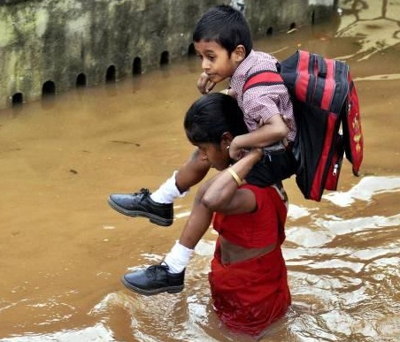 | Một phụ nữ cõng con đi học giữa nước lũ - Ảnh: The Hindu |