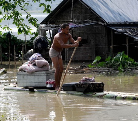 | Một người dân đang di dời tài sản trên chiếc bè chuối sau khi nhà ông ở làng Mayong, huyện Morigoan bị ngập - Ảnh: AFP |