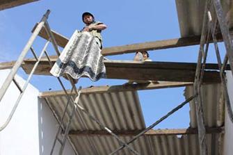 Gia đình anh Đàm Ngọc Hiên đang lợp lại mái nhà |