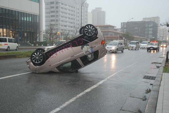 Một chiếc xe bị bão Jelawat “lật ngữa” trên đường.