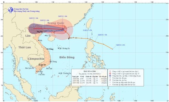 Dự báo trong 24 giờ tới, bão di chuyển theo hướng giữa Tây và Tây Tây Nam, mỗi giờ đi được khoảng 20km, đi trên đất liền phía Nam tỉnh Quảng Tây (Trung Quốc), sau đó đi vào vùng biên giới Cao Bằng – Lạng Sơn và suy yếu dần thành một vùng áp thấp. Đến 16 giờ ngày 25/7, vị trí trung tâm vùng áp thấp ở vào khoảng 22,2 độ Vĩ Bắc; 105,2 độ Kinh Đông, trên khu vực các tỉnh vùng núi phía Bắc. Sức gió mạnh nhất ở gần trung tâm vùng áp thấp giảm xuống dưới cấp 6 (tức là dưới 39 km một giờ).