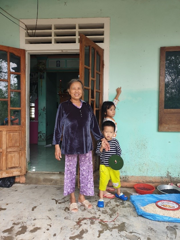 “Lũ lên nhanh và chảy xiết làm bà không kịp dọn dẹp đồ trong nhà. Nhà chỉ có hai ông bà lớn tuổi và hai cháu nhỏ, đứa lớn 7 tuổi và cháu nhỏ 3 tuổi. Ba mẹ cháu bé đi làm ăn xa chưa kịp trở về.” – Bà Phương vừa nói vừa thoăn thoát tranh thủ phơi những hạt lúa ướt còn sót sau lũ. Bà nhớ lại nước lũ lên nhanh, trời tối om như mực vì cúp điện, mà nhà chỉ có người lớn và trẻ em nên không dám chạy đi lánh nạn.