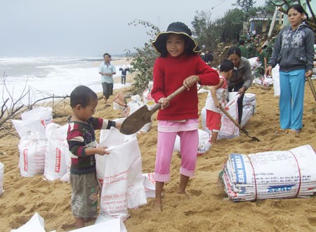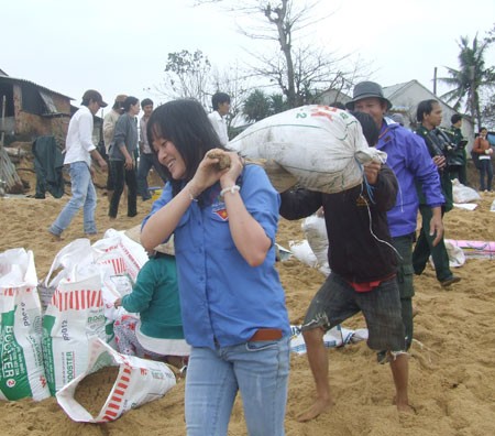 Cũng trong đợt này, xã Bình Hải đã huy động gần 100 thanh niên và hội viên Hội Liên hiệp Phụ nữ xã, thôn An Cường tham gia cùng lực lượng quân sự làm kè tạm chống sạt lở.