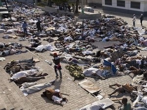 Hàng nghìn thi thể nạn nhân được tìm thấy sau động đất, tại một bệnh viện ở Port-au-Prince, ngày 14/1. (Ảnh: AFP/TTXVN) |