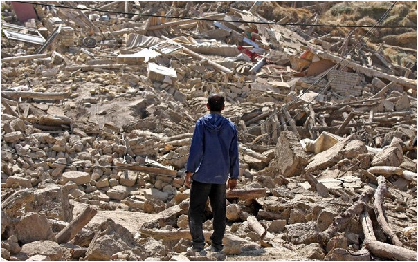 Người đàn ông đứng nhìn đống đổ nát của các tòa nhà bị phá hủy sau trận động đất tại Varzaqan, Tây Bắc Iran. |