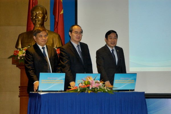 Phó Thủ tướng Nguyễn Thiện Nhân, Bộ trưởng Nguyễn Bắc Son, ông Phạm Long Trận, Lãnh đạo tập đoàn VNPT cùng bấm nút khai trương mạng TSLCD. |