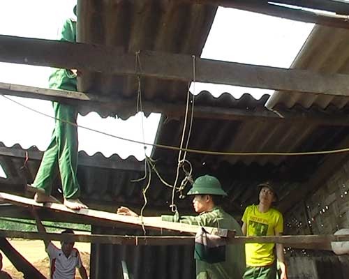 | Các chiến sĩ ban chỉ huy quân sự huyện giúp đỡ dân sửa nhà cửa sau mưa bão |