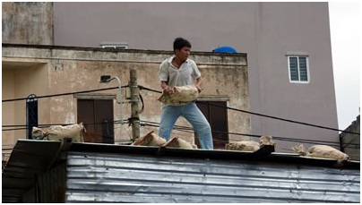 Người dân TP Đà Nẵng dùng bao cát chèn chống nhà cửa trước khi bão số 7 đổ bộ vào đất liền |