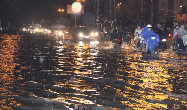 | | Đường An Dương Vương thuộc P.10, Q.6 và P.An Lạc, Q.Bình Tân ngập chìm trong biển nước. Nước sâu hơn nửa mét, xe cộ qua lại rất khó khăn, chết máy hàng loạt - Ảnh: Hữu Khoa |