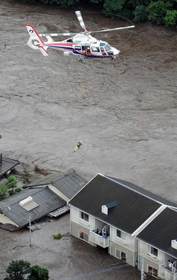 Trực thăng giải cứu người dân bị mắc kẹt tại vùng lũ ở Kumamoto hôm 12-7 - Ảnh: Mainichi |
