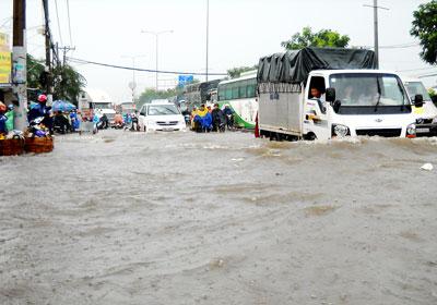 Cơn mưa như trút xảy ra trên diện rộng ở TPHCM vào chiều 9-7 đã khiến nhiều tuyến đường ở TPHCM bị ngập chìm trong biển nước và gây cảnh kẹt xe. Cụ thể, các tuyến đường như: quốc lộ 13, quốc lộ 1A, Tô Ngọc Vân, Gò Dưa, tỉnh lộ 43 (Thủ Đức), Lã Xuân Oai, Đỗ Xuân Hợp (quận 9)… bị ngập sâu từ 30-50cm. Trong đó, ngập nặng nhất là đường Gò Dưa, quốc lộ 1A (đoạn từ cầu vượt ngã tư Bình Phước về cầu vượt Gò Dưa), Tỉnh lộ 43 ở quận Thủ Đức nước ngập sâu nửa mét khiến hàng ngàn phương tiện lưu thông bị chết máy.