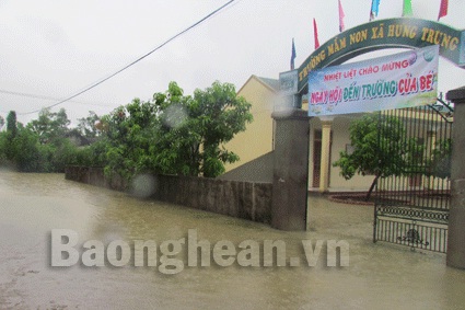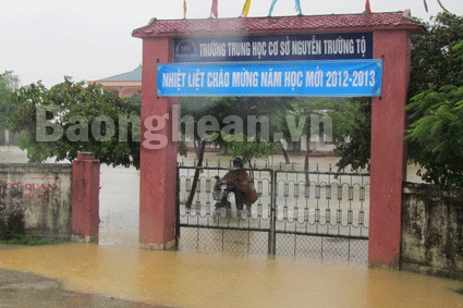 Trường THCS Nguyễn Trường Tộ thuộc xã Hưng Trung vừa khai giảng năm học mới đã chìm trong biển nước. |