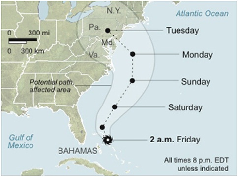 Các cơ quan dự báo cảnh báo rằng siêu bão Sandy có thể lớn và nguy hiểm hơn nhiều so với Irene, cơn bão xảy ra hồi năm ngoái khiến 47 người thiệt mạng và gây ra thiệt hại khoảng 15 tỷ USD. Sandy, hiện có sức gió 120 km/giờ, còn cách phía nam New York khoảng 850 km. Những cơn gió gây ảnh hưởng trong phạm vi 800 km tính từ tâm bão, đồng nghĩa với việc tất cả các khu vực từ bang Nam Carolina tới phía nam của Canada đều chịu ảnh hưởng. Mưa và tuyết được dự báo cùng rơi tại bang Ohio nằm sâu trong đất liền. Tình trạng khẩn cấp đã được ban bố tại một loạt các bang ở Bờ Đông. Bão Sandy cũng ảnh hưởng trực tiếp tới cuộc bầu cử tổng thống Mỹ, ở thời điểm chỉ còn chưa đầy 10 ngày nữa là tới ngày bầu cử chính thức 6/11. Hai ứng viên Obama và Mitt Romney đã phải hủy nhiều sự kiện trong chiến dịch vận động tranh cử.