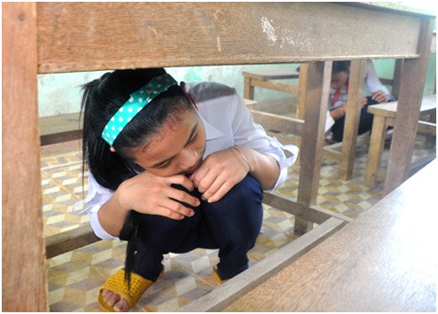Học sinh trường THCS Lê Hồng Phong, xã Trà Đốc, huyện Bắc Trà My được thầy, cô giáo hướng dẫn lẩn trốn dưới gầm bàn mỗi khi xảy ra động đất. Ảnh: Trí Tín |