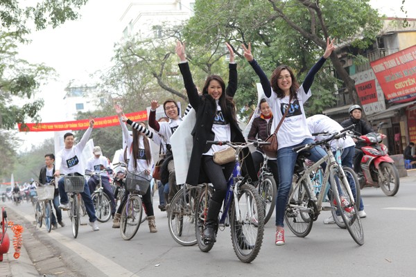 Đại sứ Giờ Trái Đất 2012 - Hoa hậu thân thiện Dương Thùy Linh và các tình nguyện viên tham gia đạp xe cổ động chương trình. (Ảnh: CTV) |