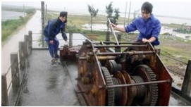 | Công nhân ngành thủy lợi kiểm tra cống CT3 tại xã Kim Đông (huyện Kim Sơn), trưa 28/10, trong điều kiện gió bão đang mạnh lên (Ảnh: TTXVN) |