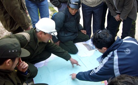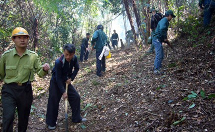 | Làm đường băng cản lửa tại khu vực giáp ranh giữa thôn Séo Mý Tỷ và thôn Dền Thàng. |