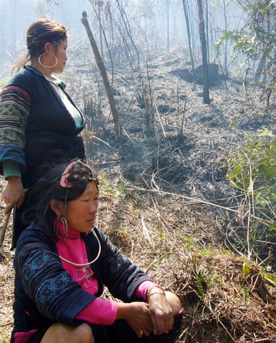 | Bà Hầu Thị Sú (người ngồi) trầm ngâm bên vạt rừng bị cháy. |