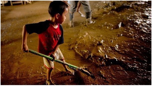 Một bé trai phụ cha dọn dẹp bùn đất sau khi nước lũ rút - Ảnh: AFP |