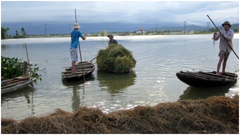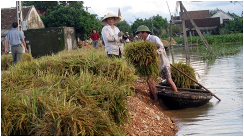 Thuyền là phương tiện duy nhất hữu hiệu lúc này giúp nông dân thu hoạch lúa |