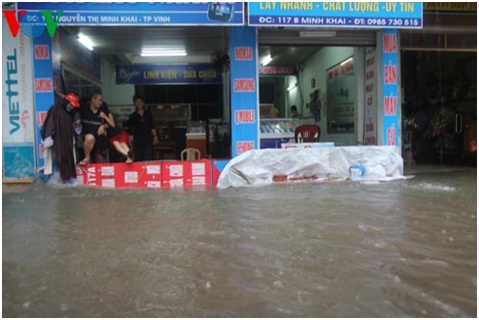 Tại ngã tư Quang Trung giao nhau với đường Phan Chu Trinh quốc lộ 1A nước ngập cũng gây khó khăn cho các phương tiện giao thông qua lại. Tại phường Lê Lợi, Quang Trung, Bến Thủy, Vinh Tân… hàng trăm hộ dân đã và đang đối mặt với nguy cơ ngập lụt, nhiều hộ dân nước đã ngập vào trong nhà từ 20-40cm và phải kê giường, bàn và các đồ dùng lên cao./.