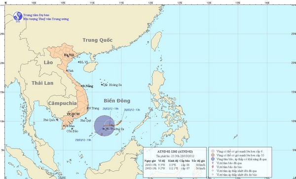 Hồi 19 giờ ngày 28/03 vị trí tâm áp thấp nhiệt đới ở vào khoảng 9,3 độ Vĩ Bắc; 113,0 độ Kinh Đông, trên khu vực quần đảo Trường Sa. Sức gió mạnh nhất ở vùng gần tâm áp thấp nhiệt đới mạnh cấp 6, cấp 7 (tức là từ 39 đến 61 km một giờ), giật cấp 8, cấp 9.