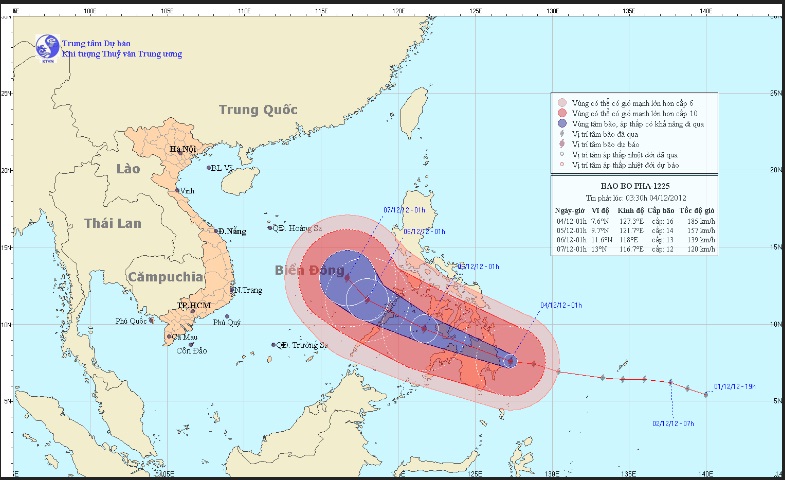 Dự báo trong 24 giờ tới, bão di chuyển theo hướng giữa Tây và Tây Tây Bắc, mỗi giờ đi được khoảng 25 km. Đến 01 giờ ngày 05/12, vị trí tâm bão ở vào khoảng 9,7 độ Vĩ Bắc; 121,7 Kinh Đông, cách đảo Pa – La – Oan (Philippin) khoảng 250km về phía Đông Đông Nam. Sức gió mạnh nhất vùng gần tâm bão mạnh cấp 13, cấp 14 (tức là từ 134 đến 166 km một giờ), giật cấp 15, cấp 16.