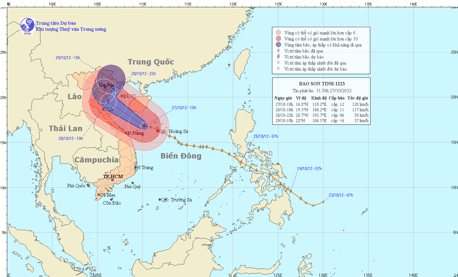 Hồi 10 giờ ngày 27/10, vị trí tâm bão ở vào khoảng 16,8 độ Vĩ Bắc; 110,2 độ Kinh Đông, trên khu vực phía Tây Bắc quần đảo Hoàng Sa, cách bờ biển các tỉnh Thừa Thiên Huế - Quảng Nam khoảng 220 km về phía Đông Đông Bắc. Sức gió mạnh nhất ở vùng gần tâm bão mạnh cấp 12 (tức là từ 118 đến 133 km một giờ), giật cấp 13, cấp 14.