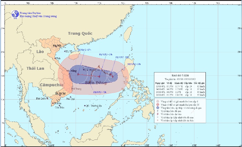 Dự báo trong 24 giờ tới, bão có khả năng đổi hướng về phía Nam, mỗi giờ đi được khoảng 5 km và có khả năng mạnh thêm. Đến 07 giờ ngày 04/10, vị trí tâm bão ở vào khoảng 14,8 độ Vĩ Bắc; 117,8 độ Kinh Đông, cách quần đảo Hoàng Sa khoảng 660 km về phía Đông Đông Nam. Sức gió mạnh nhất vùng gần tâm bão mạnh cấp 9, cấp 10 (tức là từ 75 đến 102 km một giờ), giật cấp 11, cấp 12.