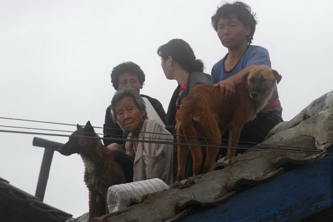 Người dân leo lên các tầng cao, mái nhà để tránh lũ - Ảnh: KCNA |