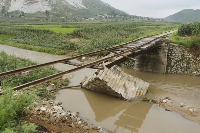 Một cây cầu cho xe lửa đi bị phá hủy sau mưa lũ ở huyện Onchon - Ảnh: AP |