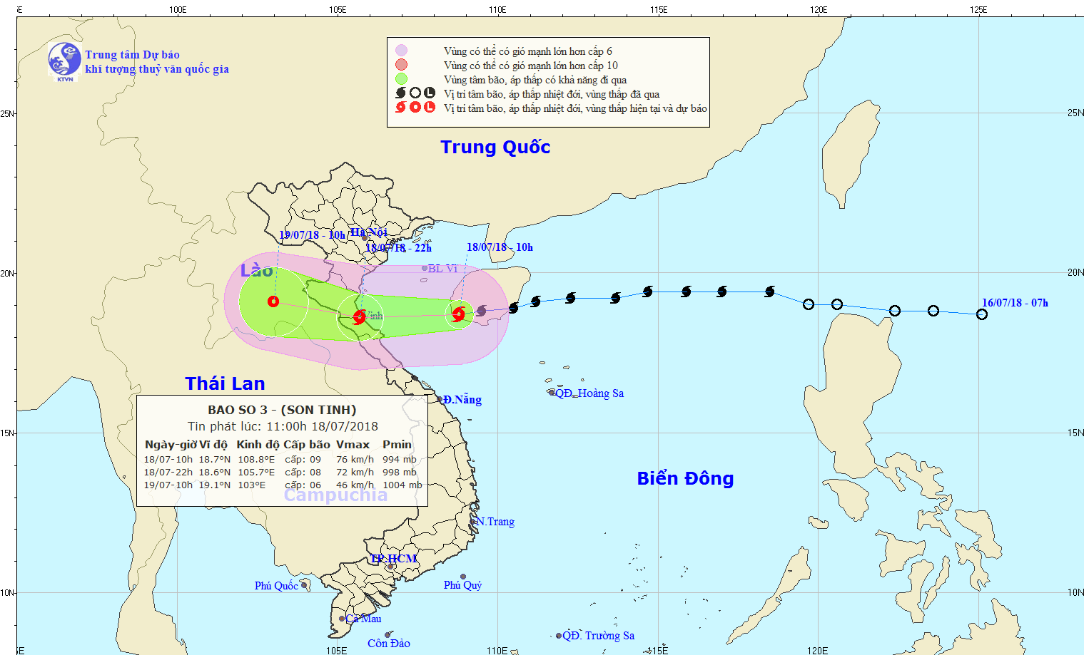 Hồi 01 giờ ngày 18/07, vị trí tâm bão ở vào khoảng 19,1 độ Vĩ Bắc; 111,2 độ Kinh Đông, trên vùng biển phía Đông đảo Hải Nam, cách đất liền các tỉnh từ Hải Phòng đến Hà Tĩnh khoảng 530km về phía Đông. Sức gió mạnh nhất vùng gần tâm bão mạnh cấp 9 (75-90km/giờ), giật cấp 11.