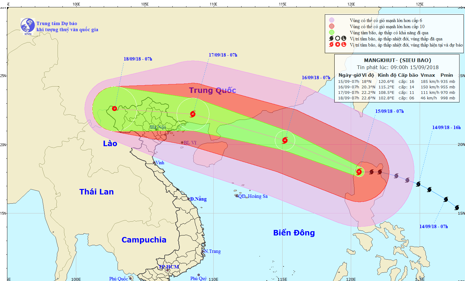 Hồi 19 giờ ngày 14/9, vị trí tâm siêu bão Mangkhut ở vào khoảng 14,9 độ Vĩ Bắc; 128,9 độ Kinh Đông, cách đảo Lu-Dông (Philippines) khoảng 830km về phía Đông Đông Nam. Sức gió mạnh nhất vùng gần tâm siêu bão mạnh cấp 17 (200-220km/giờ), giật trên cấp 17.