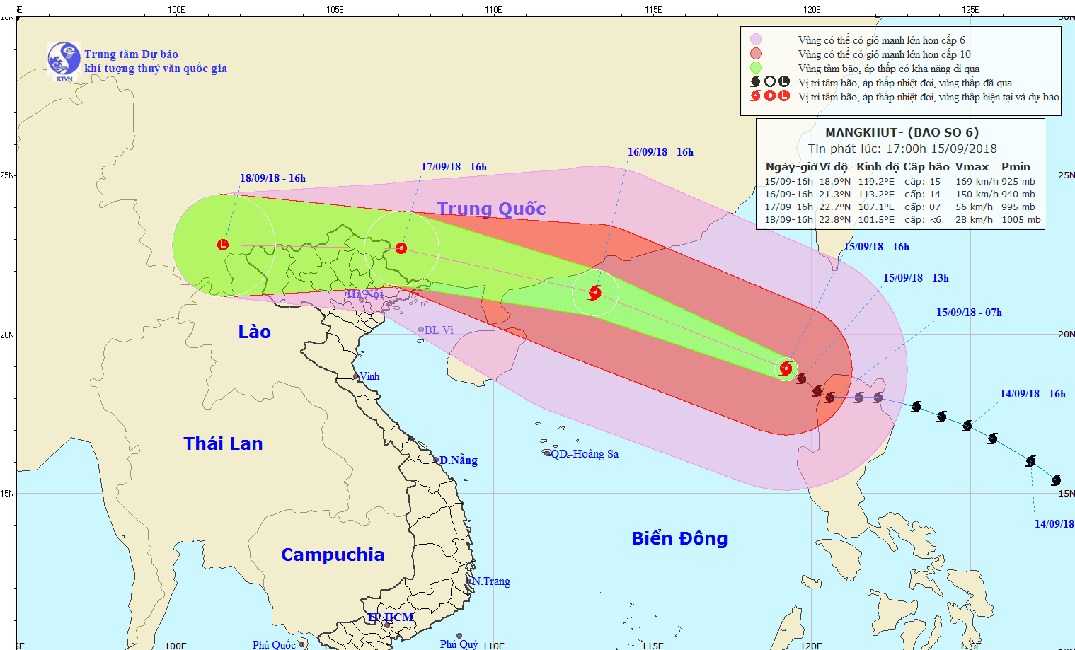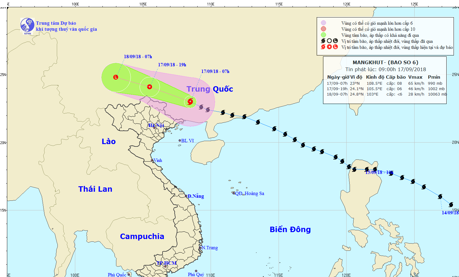 Hồi 01 giờ ngày 13/9, vị trí tâm bão MANGKHUT ở vào khoảng 14,4 độ Vĩ Bắc; 132,5 độ Kinh Đông. Sức gió mạnh nhất vùng gần tâm bão mạnh cấp 17 (200-220km/giờ), giật trên cấp 17.