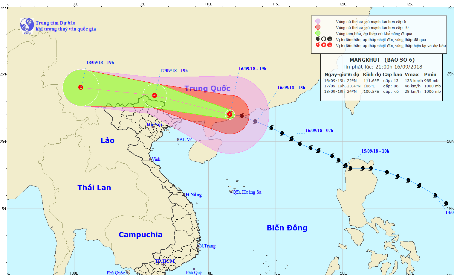 Hồi 4 giờ ngày 16/9, vị trí tâm bão ở vào khoảng 20,2 độ Vĩ Bắc; 116,2 độ Kinh Đông, trên khu vực Đông Bắc Biển Đông, cách Ma Cao (Trung Quốc) khoảng 400km về phía Đông Đông Nam. Sức gió mạnh nhất vùng gần tâm bão mạnh cấp 14 (150km/giờ), giật cấp 17.