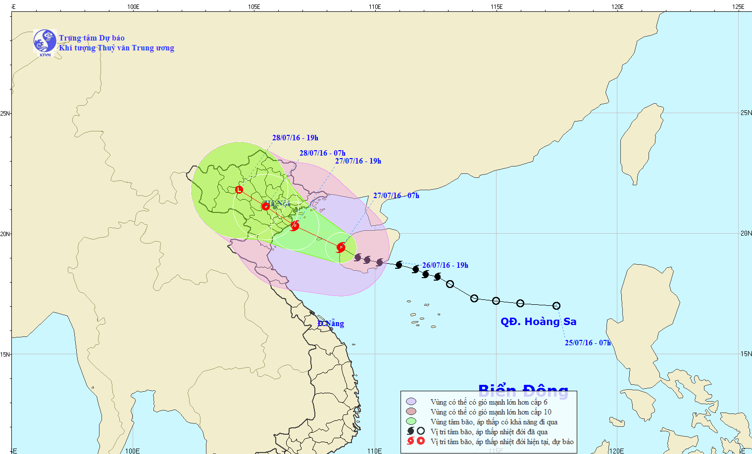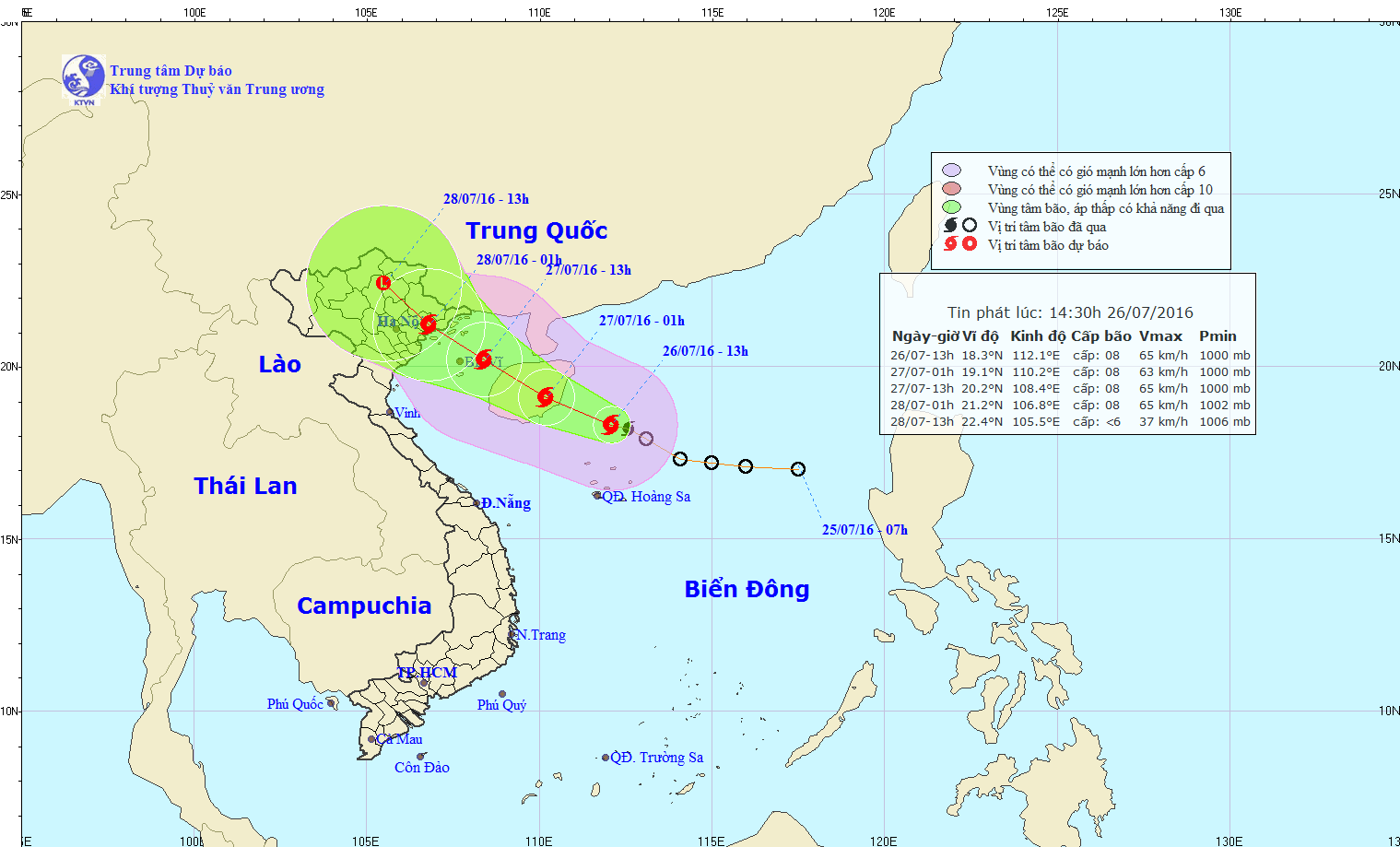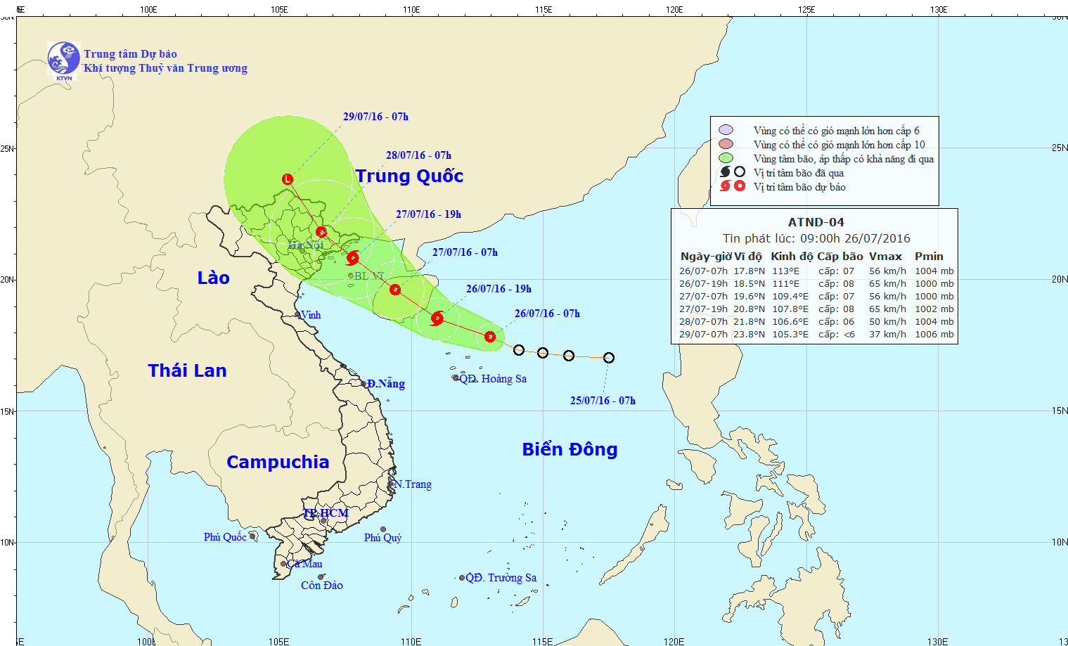 Hồi 08 giờ ngày 26/7, vị trí tâm áp thấp nhiệt đới ở vào khoảng 17,8 độ vĩ Bắc; 113,0 độ kinh Đông, cách quần đảo Hoàng Sa khoảng 120km về phía Bắc Đông Bắc. Sức gió mạnh nhất ở vùng gần tâm áp thấp nhiệt đới mạnh cấp 7 (50-60km/h), giật cấp 8-9.
