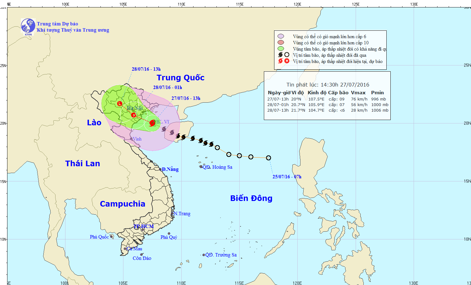 Hồi 14 giờ ngày 27/7, vị trí tâm bão ở vào khoảng 20,0 độ vĩ Bắc; 107,4 độ kinh Đông, cách bờ biển các tỉnh Thái Bình-Ninh Bình 100km về phía Đông Nam. Sức gió mạnh nhất ở vùng gần tâm bão mạnh cấp 9 (75-90km/h), giật cấp 10-12.