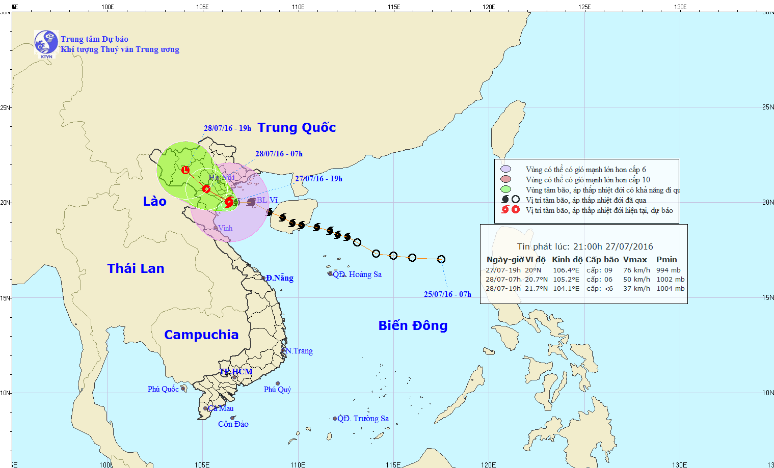 Hồi 16 giờ ngày 27/7, vị trí tâm bão ở vào khoảng 20,0 độ vĩ Bắc; 106,8 độ kinh Đông, ngay trên vùng biển các tỉnh Thái Bình-Ninh Bình. Sức gió mạnh nhất ở vùng gần tâm bão mạnh cấp 9 (75-90km/h), giật cấp 10-12.