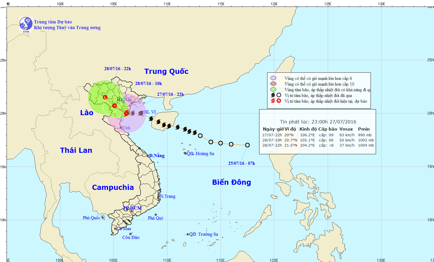 Hồi 23 giờ ngày 27/7, vị trí tâm bão ở vào khoảng 20,0 độ vĩ Bắc; 106,2 độ kinh Đông, trên bờ biển các tỉnh Thái Bình-Ninh Bình. Sức gió mạnh nhất ở vùng gần tâm bão mạnh cấp 9 (75-90km/h), giật cấp 11-13.