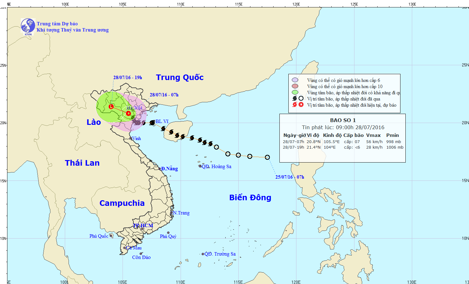 Hồi 05 giờ ngày 28/7, vị trí tâm bão ở vào khoảng 20,4 độ vĩ Bắc; 105,8 độ kinh Đông, trên đất liền các tỉnh Nam Đồng bằng Bắc Bộ. Sức gió mạnh nhất ở vùng gần tâm bão mạnh cấp 8 (60-75km/h), giật cấp 9-11.