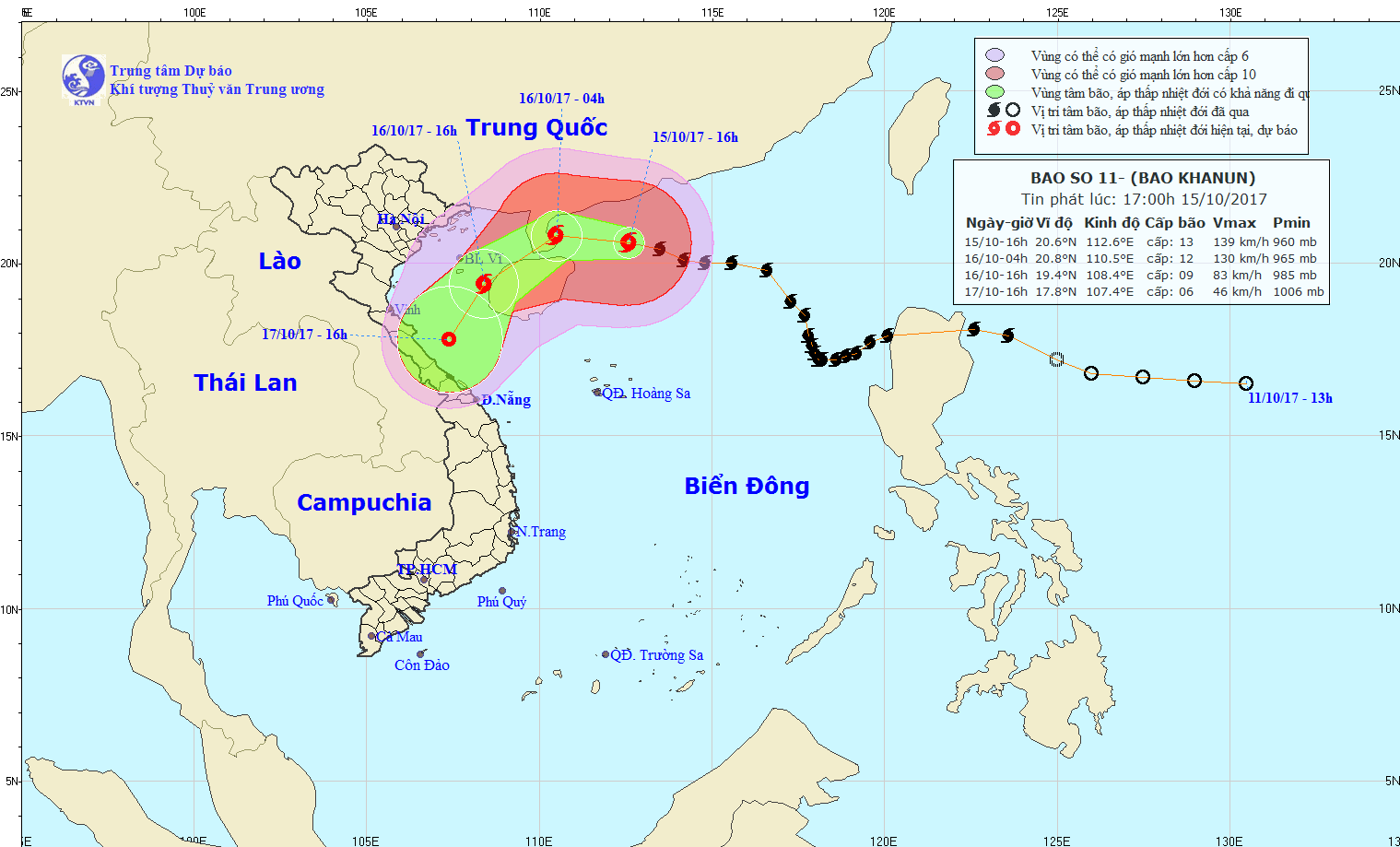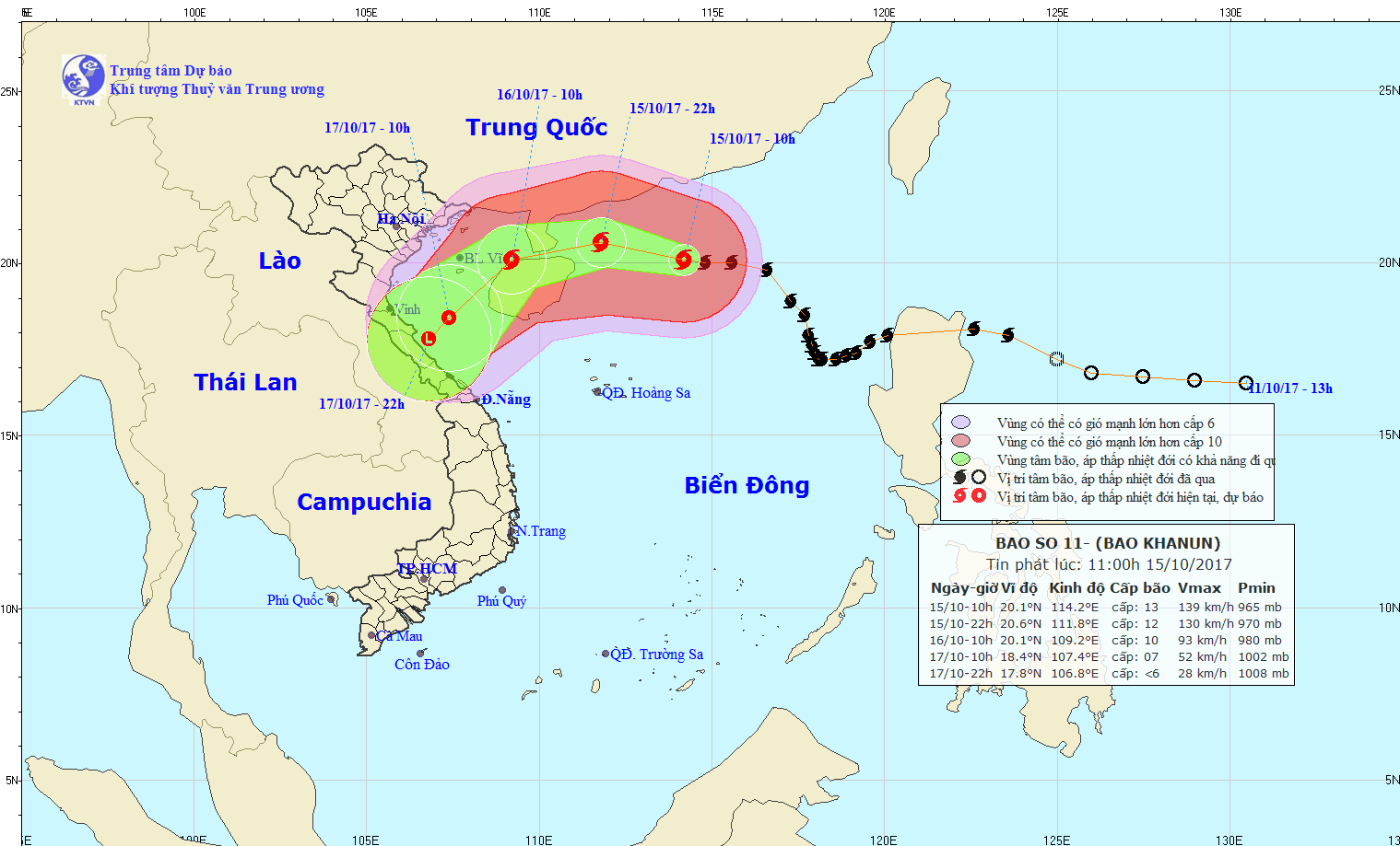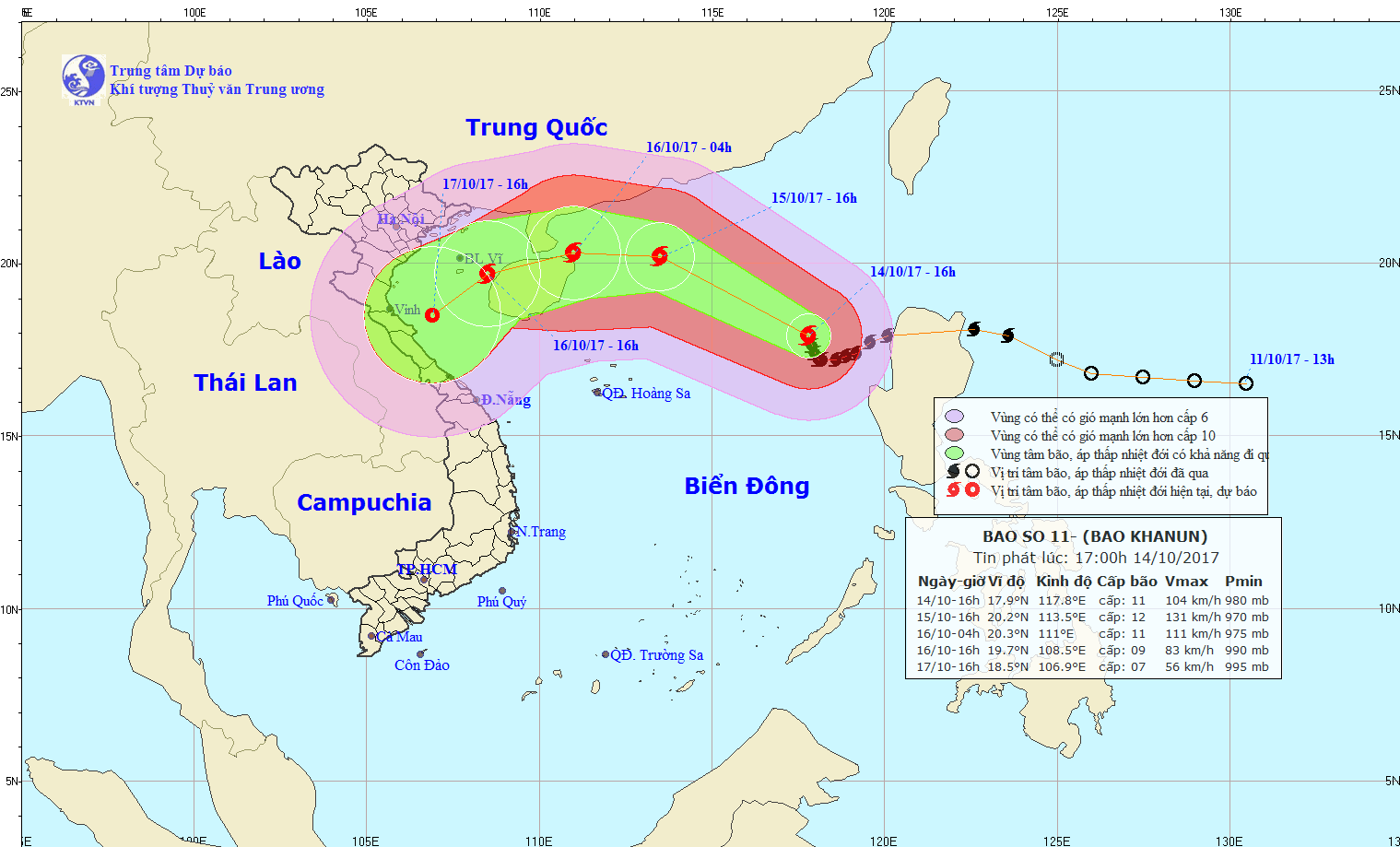 Hồi 13 giờ ngày 14/10, vị trí tâm bão ở vào khoảng 17,6 độ Vĩ Bắc; 117,9 độ Kinh Đông, cách quần đảo Hoàng Sa khoảng 600km về phía Đông Đông Bắc. Sức gió mạnh nhất ở vùng gần tâm bão mạnh cấp 10-11 (90-115km/giờ), giật cấp 13.