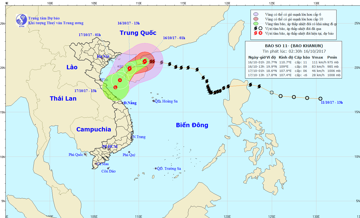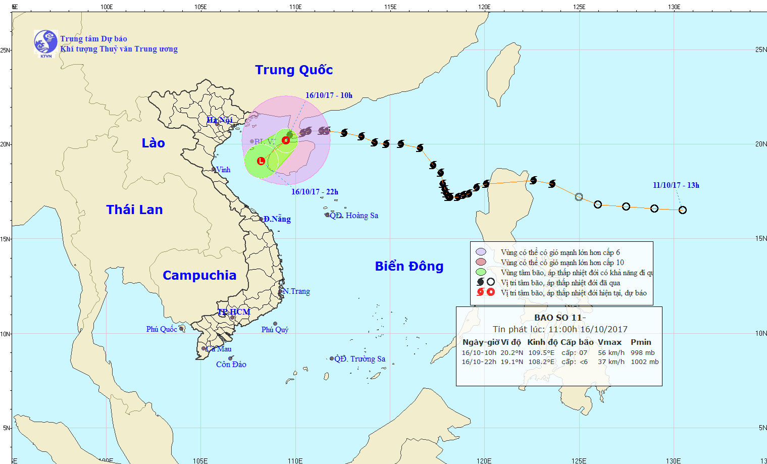 Hồi 01 giờ ngày 16/10, vị trí tâm bão ở vào khoảng 20,7 độ Vĩ Bắc; 110,7 độ Kinh Đông, trên khu vực phía Đông bán đảo Lôi Châu (Trung Quốc). Sức gió mạnh nhất ở vùng gần tâm bão mạnh cấp 11 (100-115km/giờ), giật cấp 14.