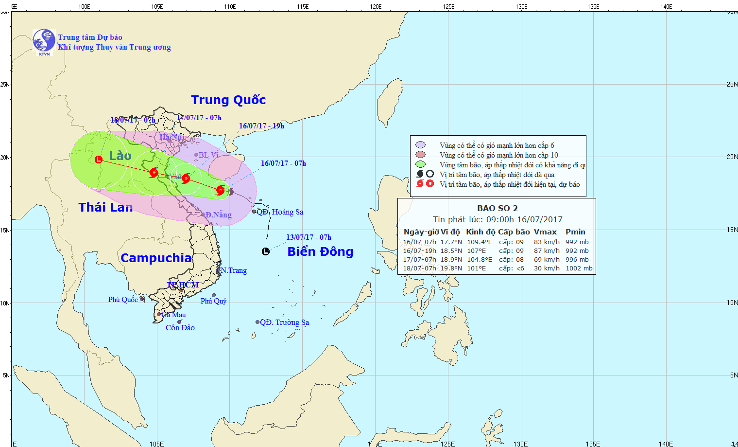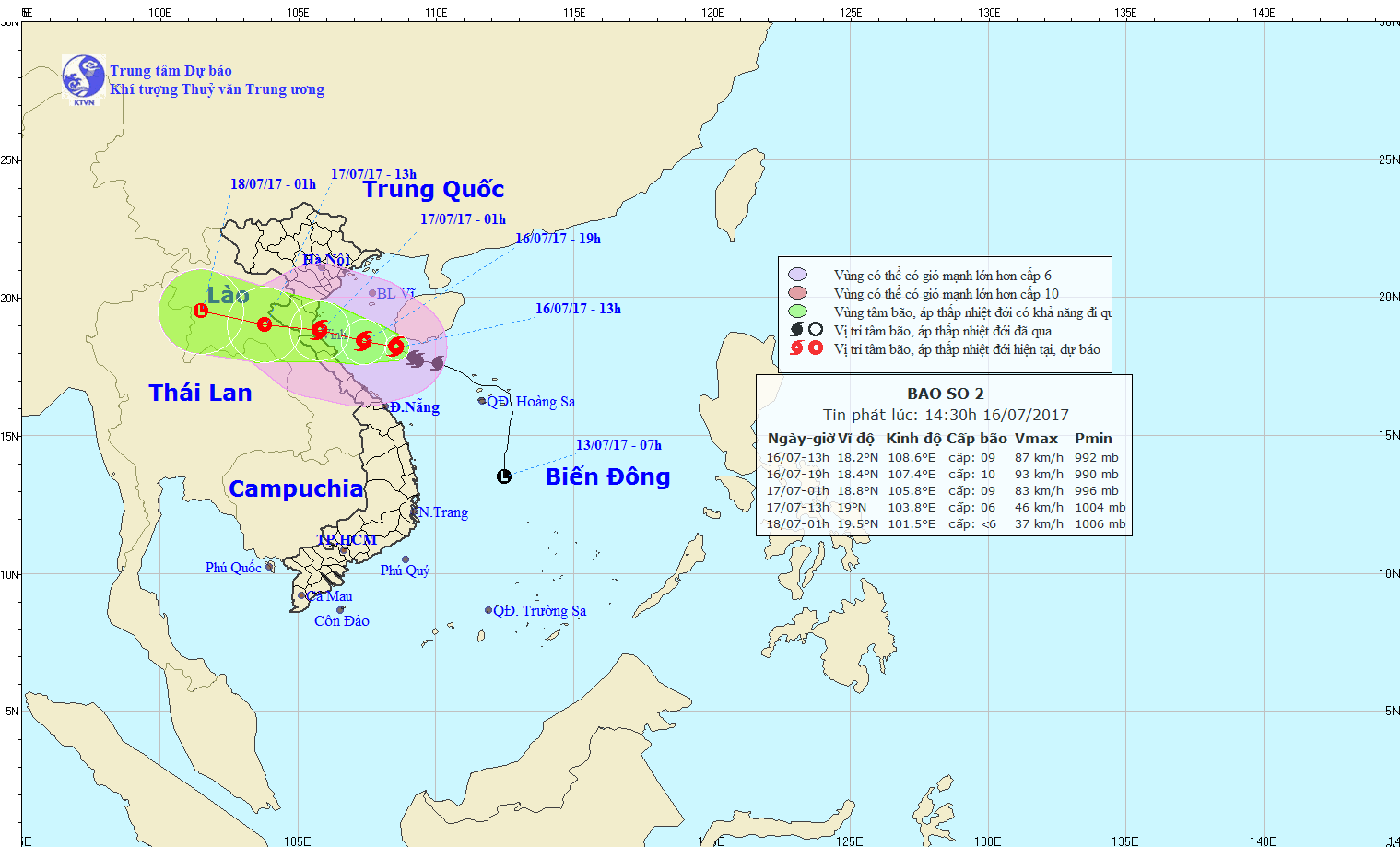 Hồi 13 giờ ngày 16/07, vị trí tâm bão ở vào khoảng 18,2 độ Vĩ Bắc; 108,6 độ Kinh Đông, cách bờ biển các tỉnh Thanh Hóa-Hà Tĩnh khoảng 290km về phía Đông Đông Nam. Sức gió mạnh nhất ở vùng gần tâm bão mạnh cấp 9-10 (75-100km/giờ), giật cấp 11-12.