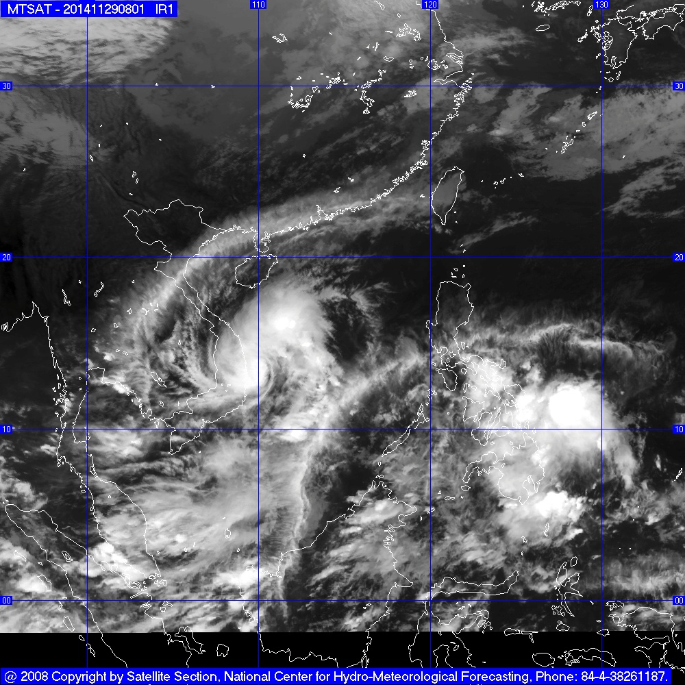 Hồi 22 giờ ngày 29/11, tâm bão ở vào khoảng 13,4 độ Vĩ Bắc; 109,4 độ Kinh Đông; trên vùng bờ biển Bình Định – Phú Yên; cường độ bão mạnh cấp 8 (tức là từ 62 đến 74 km một giờ), giật cấp 9, cấp 10.